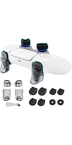 The NiTHO Gaming Kit for PS5 controllers includes silicone grip covers, thumb grip caps, and analog mini-stick precision rings designed exclusively for the original PS5 controller. This set improves targeting accuracy, enhances grip comfort with sweat-resistant materials, and offers easy installation for a customizable gaming experience that reduces hand fatigue and prevents controller slips during intense gameplay.