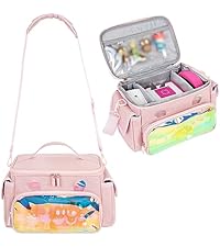 This pink Toniebox carrying case by Jaffzora offers a durable, waterproof, and tear-resistant storage solution with a spacious 12" x 7" x 9" interior. Featuring three organized compartments, a unique speaker window for uninterrupted audio, and multiple clear pockets, it’s designed for easy access and travel convenience with a sturdy handle and detachable shoulder strap.