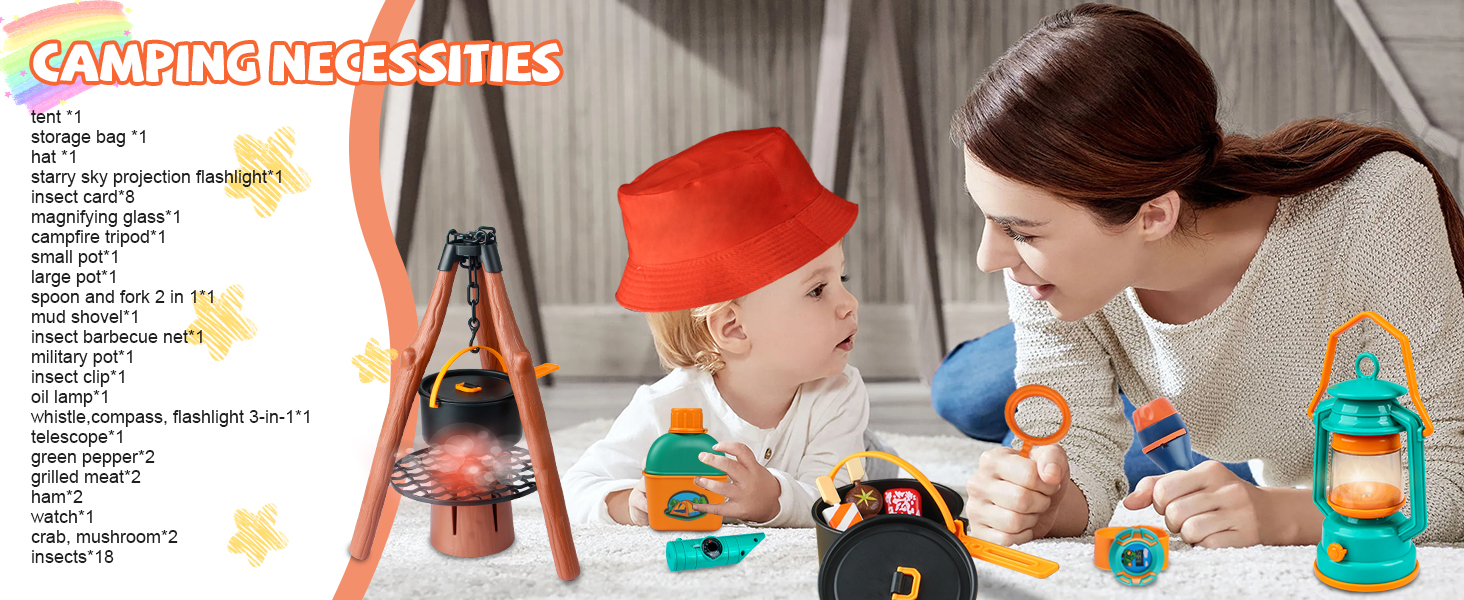 Qtioucp Kids Camping Set 50pcs with Tent & Space Projector Flashlight- Outdoor Campfire Toy Set for Toddlers Kids - Pretend Play Camp Gear Tools for Birthday Christmas
